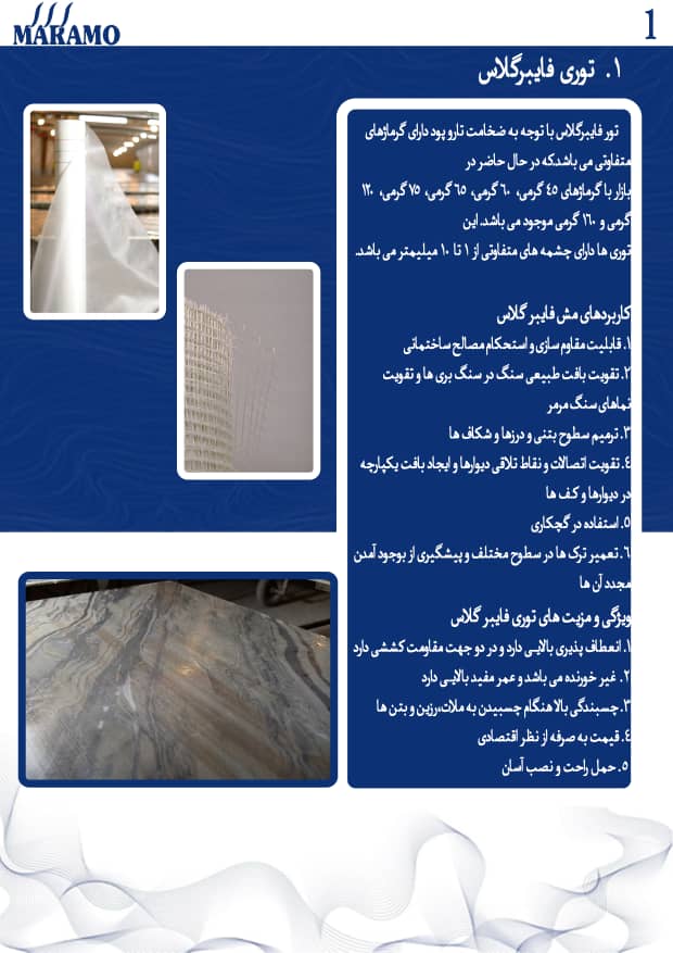 - مش فایبر گلاس با گرماژ ۱۴۵ گرم بر متر مربع برای مقاوم سازی کف به عنوان جایگزینی برای مش فلزی سنتی استفاده می شود.